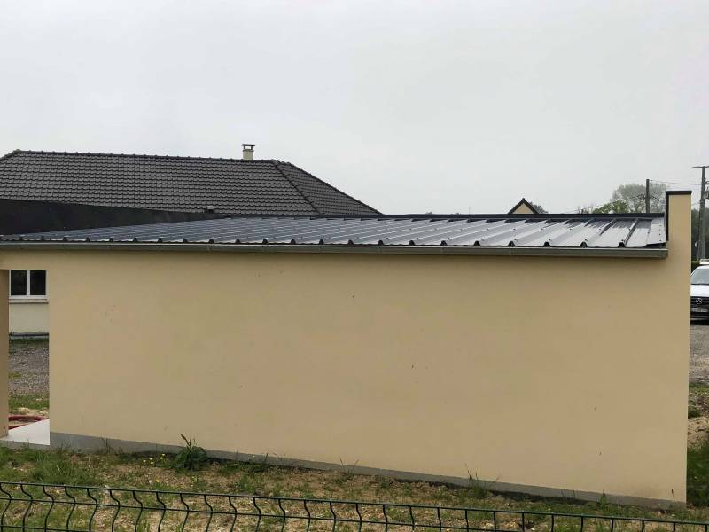 Par la suite nous avons réaliser la pose de charpente avec sa toiture en tôle bac acier isolante 75/100 ème 35 microns suivi de la pose de gouttière PVC couleur sable.