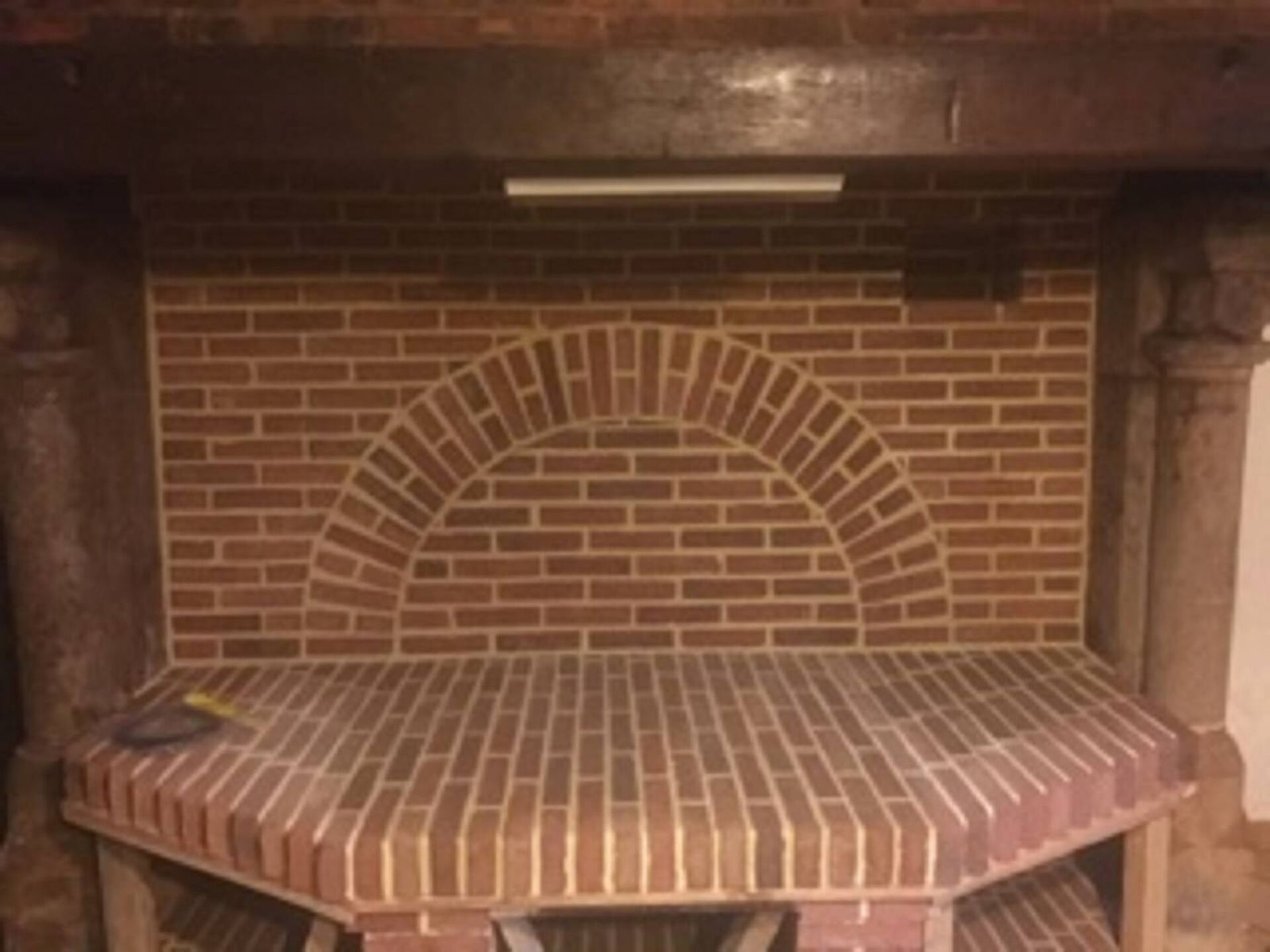 Poursuivi de la maçonnerie des briques sur la paroi du fond de la cheminée avec pour la finition la réalisation des joints à la chaux en ton beige.