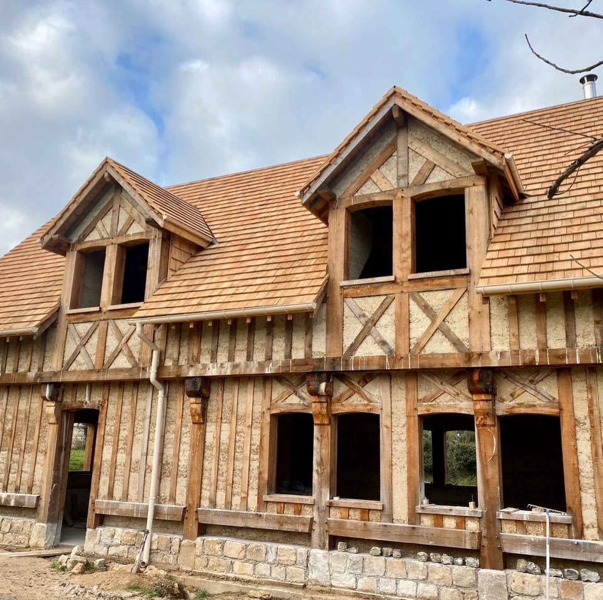 L'entreprise LEPLAY SARL maçonnerie, couverture et menuiserie est intervenu au alentour de Fécamp proche de Valmont sur une rénovation de souche de cheminée extérieur "poujoulat" carré noir et le changement de gouttière.