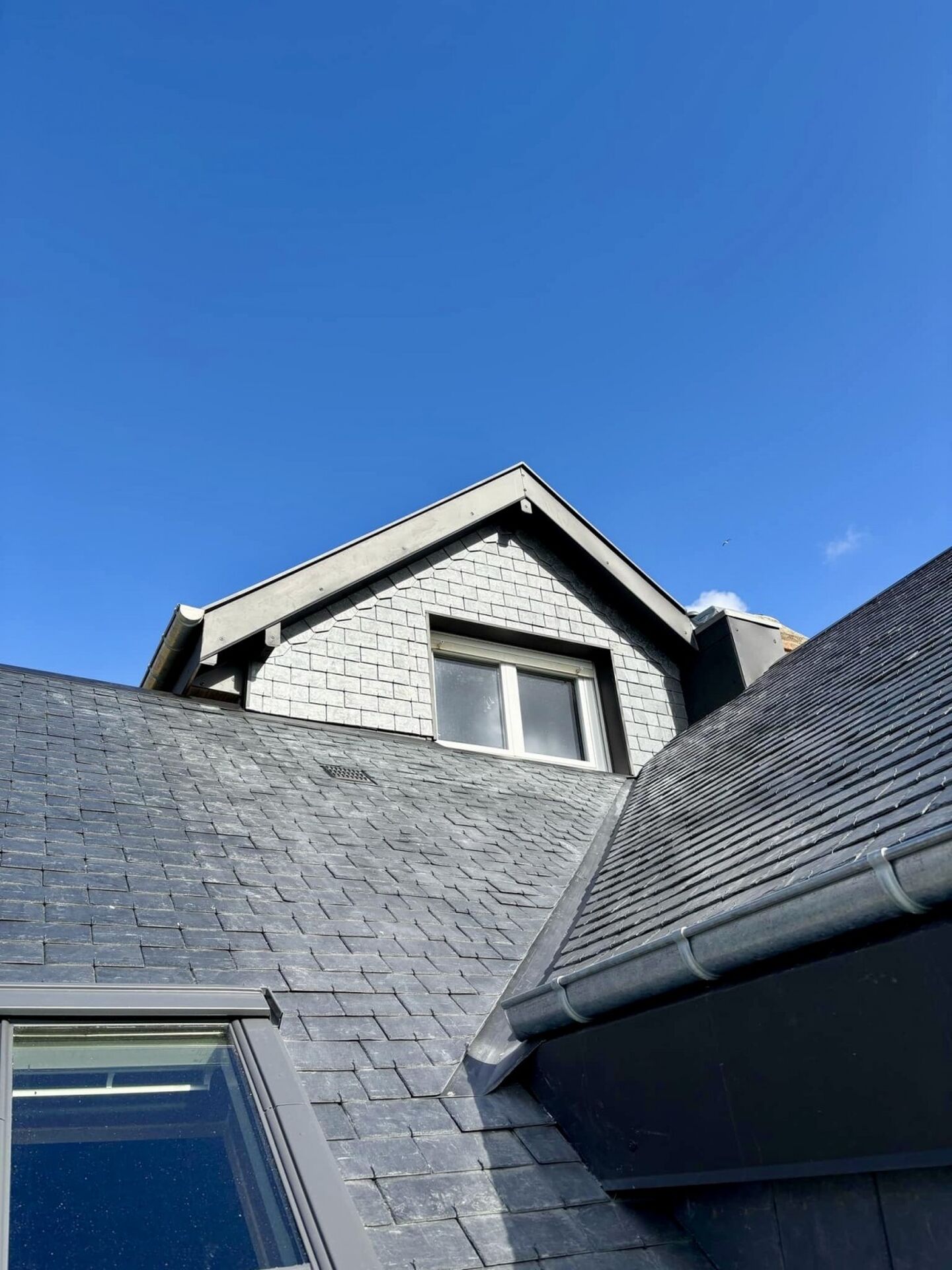 Secteur de Fécamp proche d'Etretat, la SARL LEPLAY situé à Valmont à réalisée avec ses équipes une couverture en ardoise naturel d'Espagne 40/22 aux crochets inox d'Anjou.
